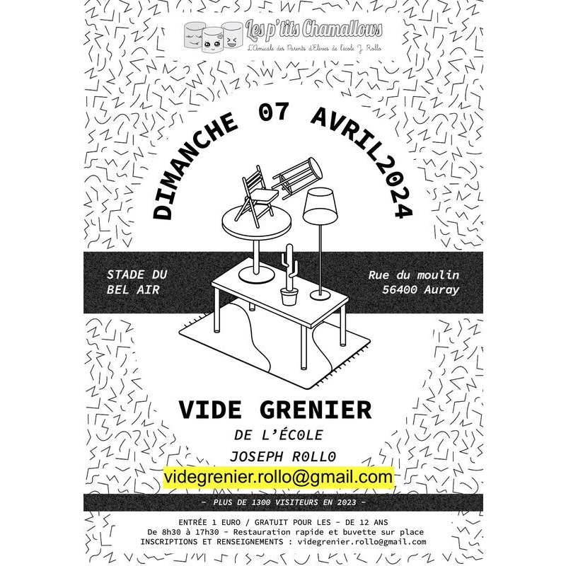 L’association "les p'tits chamallows" auray organise le dimanche 7 avril 2024 un vide-grenier qui se déroulera au stade du bel air à auray.