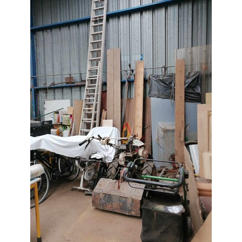 Outils jardin, visserie, bascule, planches, grillage,, échelles ,futs réserves d'eau,