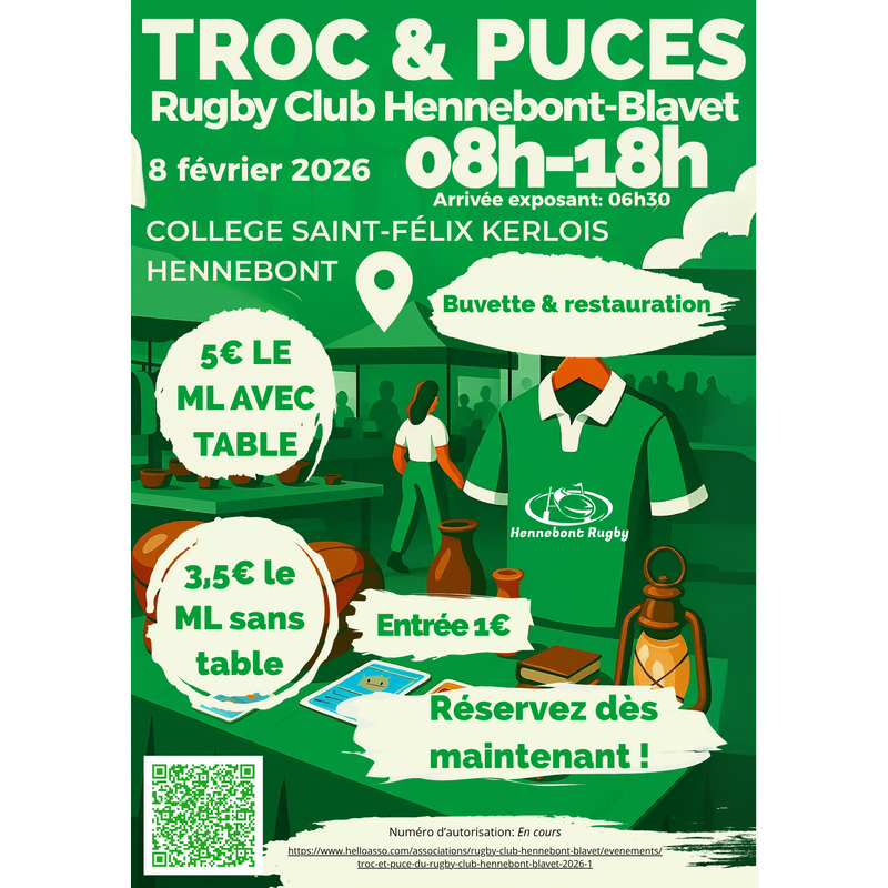 Le rugby club hennebont blavet vous propose un troc et puce dimanche 8 février 2026, au collège saint félix kerlois, à hennebont.
