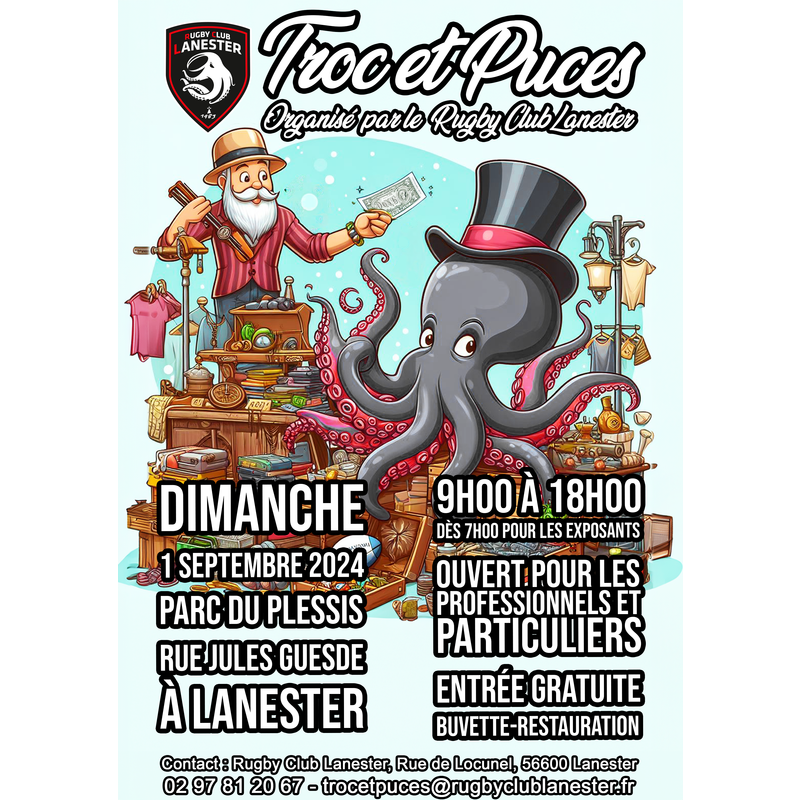 exposants et chineurs, soyez les bienvenus à la 22e édition du troc et puces, organisée par l’association du rugby club lanester bretagne sud.