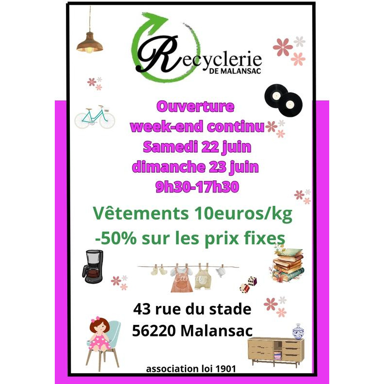 La recyclerie ouvre de 9h30 à 17h30 samedi et dimanche, avec 10euros le kilo de vêtements et -50% sur les prix fixes.