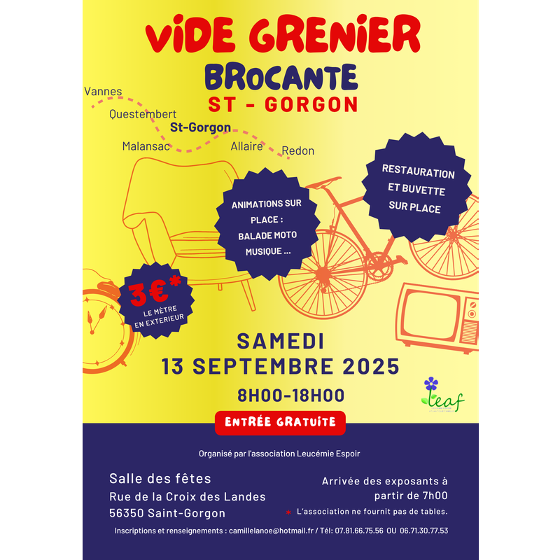 Le vide grenier de l'association leucémie espoir de saint gorgon se tiendra le samedi 13 septembre à la salle des fêtes de 8h à 18h. Dans l'après midi aura lieu une balade moto et la journée se terminera par un repas dansant animé par magic dance.