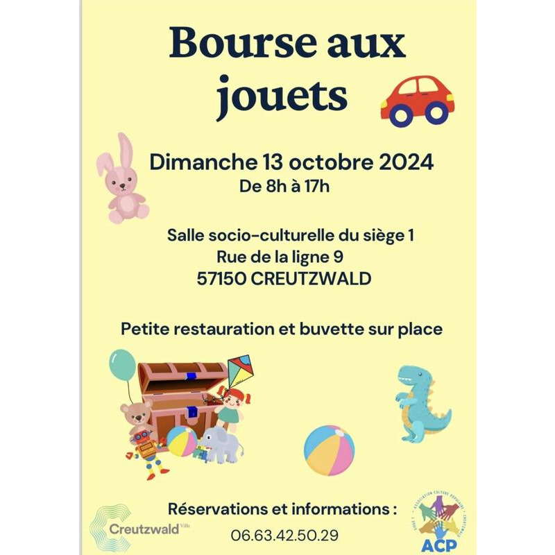L'association culture populaire organise une bourse aux jouets le 13 octobre 2024 avec petite restauration sur place.