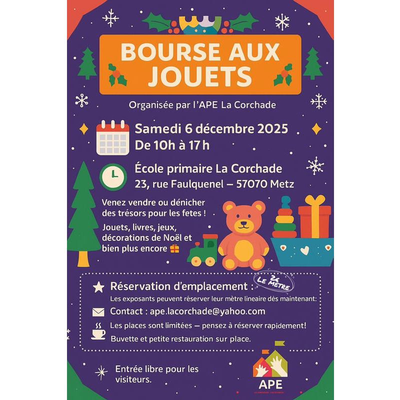 L’association des parents d’élèves de l’école primaire la corchade organise sa première bourse aux jouets le samedi 6 décembre 2025, de 10h à 17h, dans la cour de l’école la corchade à metz (57070).