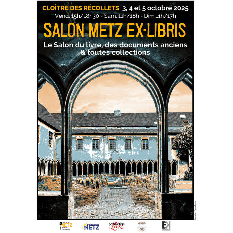 Metz ex- libris : salon du livre, des documents anciens et toutes collections. Vendredi 3 octobre 15h/ 18h30 samedi 4 octobre 11h - 18h dimanche 5 octobre 11h-17h environ 30 libraires professionnels, réunis sur 200 m2 d’un lieu unique au cœur du vieux metz. On y trouvera une multitude de documents aussi variés que différents, écrits, imprimés, dessinés, peints ou gravés, de la première édition à nos jours : livres anciens et d’occasion – militaria -manuscrits – estampes - gravures - presse et magazines - bandes dessinées - cartes postales – affiches publicitaires, de collection et de cinéma - objets cartonnés, décoratifs et de collection – dessins - peinture – photographies – disques…