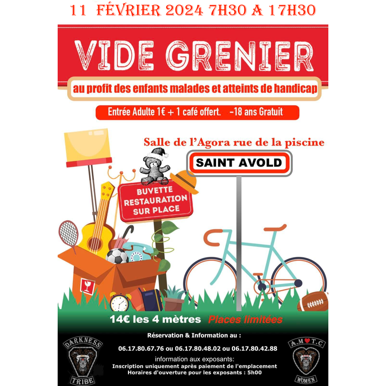 Saucisses/ frites/ gâteaux. Limitation des stands de vêtements pour maximiser la surface des puces. Boisson chaude offerte à chaque visiteur ayant payé son entrée.
