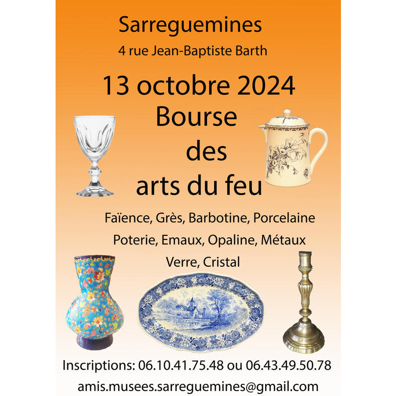 Objets proposés à la vente = faïences, grès, barbotine ou majolique, porcelaine, poterie, émaux, verre, cristal, opaline, objets d'arts en métal . Buvette, gâteaux et tartes . Possibilité de déjeuner sur place sur inscription .