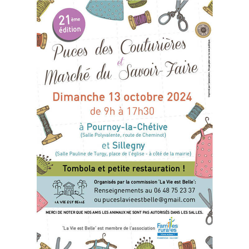 La vie est belle de l'association familles rurales pommerieux-sillegny organise, pour la 21 ème fois, les puces des couturières et marché du savoir-faire dans les salles polyvalentes de sillegny (salle pauline de turgy, place de l'église), et pournoy-la-chetive (salle polyvalente route de cheminot).