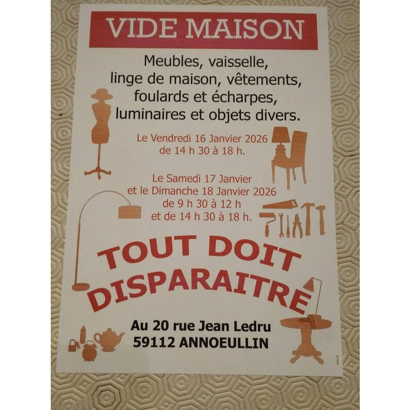 Meubles, vaisselle, linge de maison, vêtements, foulards et écharpes, luminaires et objets divers. Tout doit disparaître