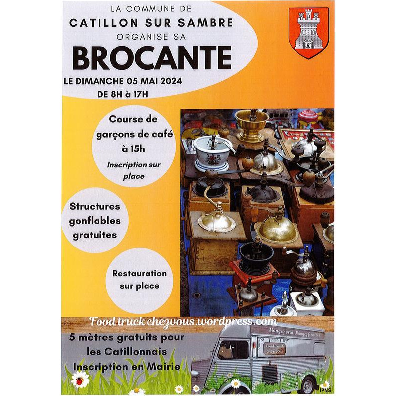 Brocante annuelle de catillon sur sambre avec course de garçon de café à 15h, restauration sur place et structures gonflables pour les enfants.