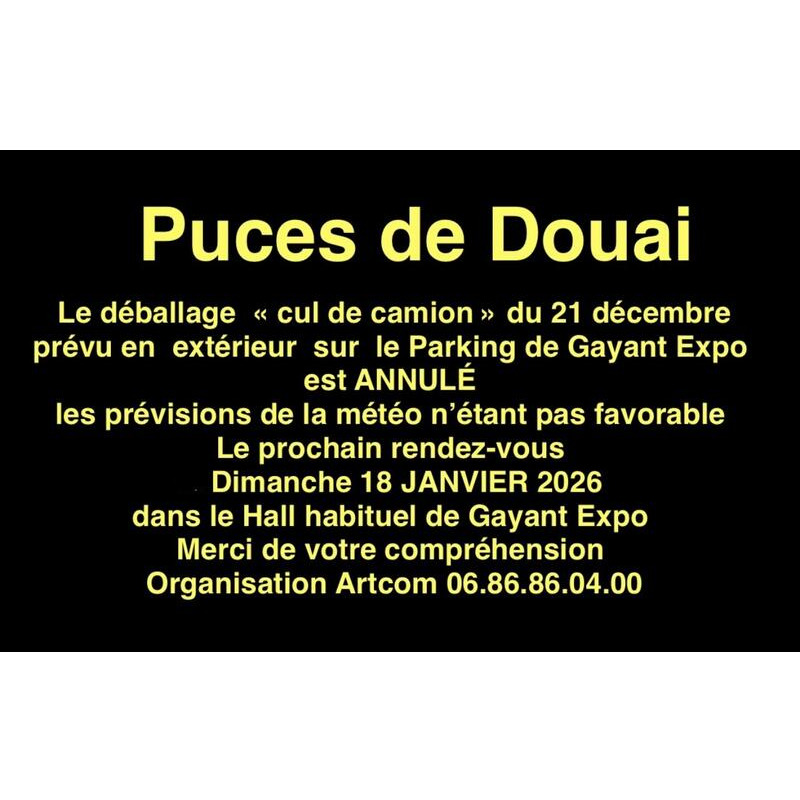 le déballage « cul de camion » sur le parking de gayant expo prévu le dimanche 21 décembre est annulé les prévisions de la météo n’étant pas favorable , en effet nous n’avions pas de hall de disponible en raison d’une série de concerts du groupe indochine .