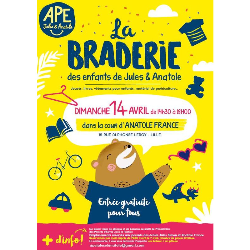 Braderie des enfants de jules et anatole, organisée par l'association des parents d'élèves des écoles jules simon et anatole france, quartier st maurice à lille. Jouets, livres, vêtements pour enfants, matériel de puériculture...