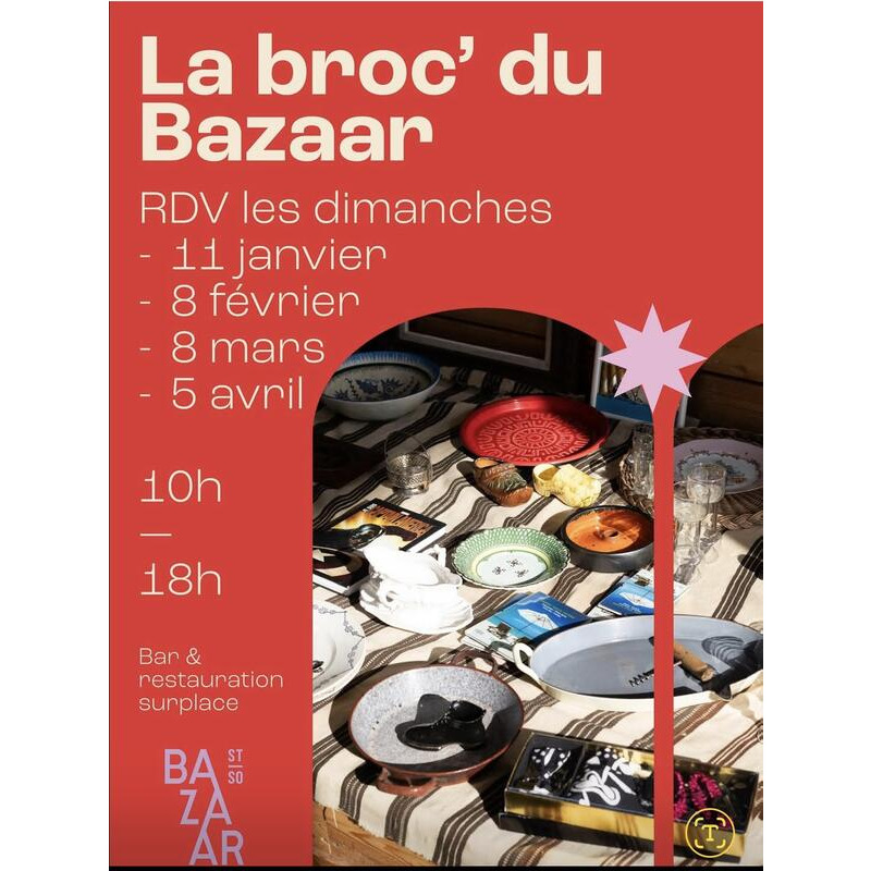 La brocante du bazaar, c'est le rendez-vous incontournable, chaque mois, pour tous les amoureux dobjets qui ont une histoire, de mobilier plein de caractère et de trouvailles déco qu'on ne voit nulle part ailleurs, ce dimanche, les halles du bazaar se transforment en véritable caverne aux trésors : - flânez entre les stands¥ échangez avec des exposants passionnés - dénichez des pièces uniques, du vintage authentique que vous soyez collectionneur, amateur de beaux objets ou simple curieux, la pépite qui vous manquait vous attend et pour les pauses entre deux trouvailles : bar & petite restauration sur place parce qu'une bonne brocante se savoure aussi autour d'un café ou d'une douceur. On se retrouve ce dimanche au bazaar