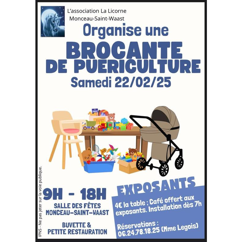 L'association la licorne de monceau saint-waast organise sa traditionnelle brocante de l'enfant (jouets vêtements puériculture) à la salle des fêtes de monceau saint-waast le samedi 22/02/2025 de 9h à 18h. Buvette et petite restauration sur place.