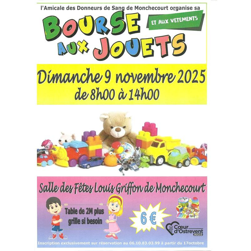 18ème bourse aux jouets et vêtements enfants, organisée à la salle des fêtes louis griffon le dimanche 9 novembre 2025 de 8h00 à 14h00, 1 rue pierre de coubertin à monchecourt. Bourse ouverte aux particuliers exclusivement!