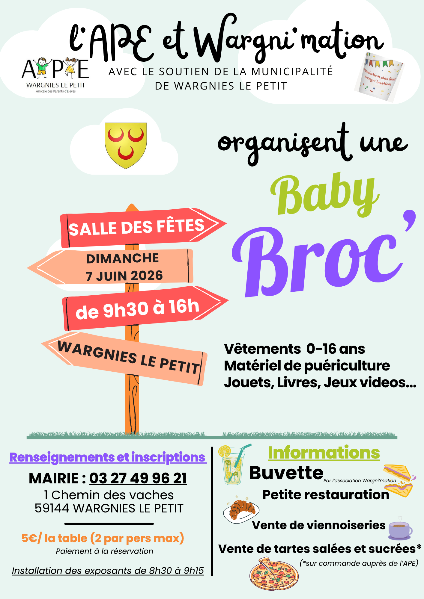 Buvette et petite restauration sur place (viennoiseries et tartes salées / sucrées sur pré commande uniquement, voir la page de l'APE sur FB) .