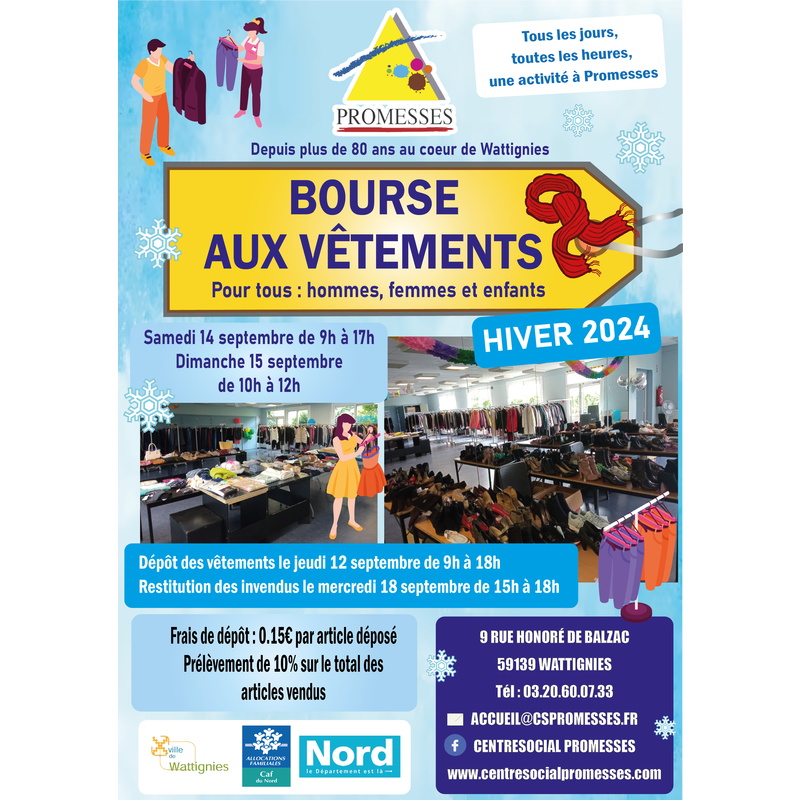 Le centre social propose sa bourse aux vêtements d'hiver 2024, l'occasion de trouver de beaux vêtements à petits prix (pour tous : hommes, femmes, enfants).