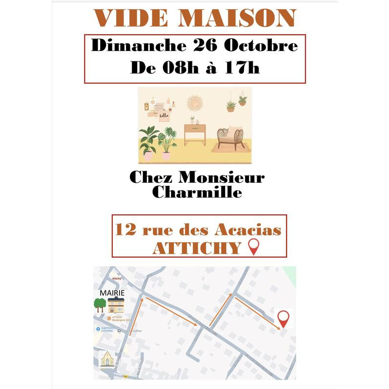 Vide maison, c’est le dimanche 26 octobre 2025 et ça se passe au 12 rue des acacias à attichy : meubles, bibelots, vaisselle, tableaux, outils, tapisserie….