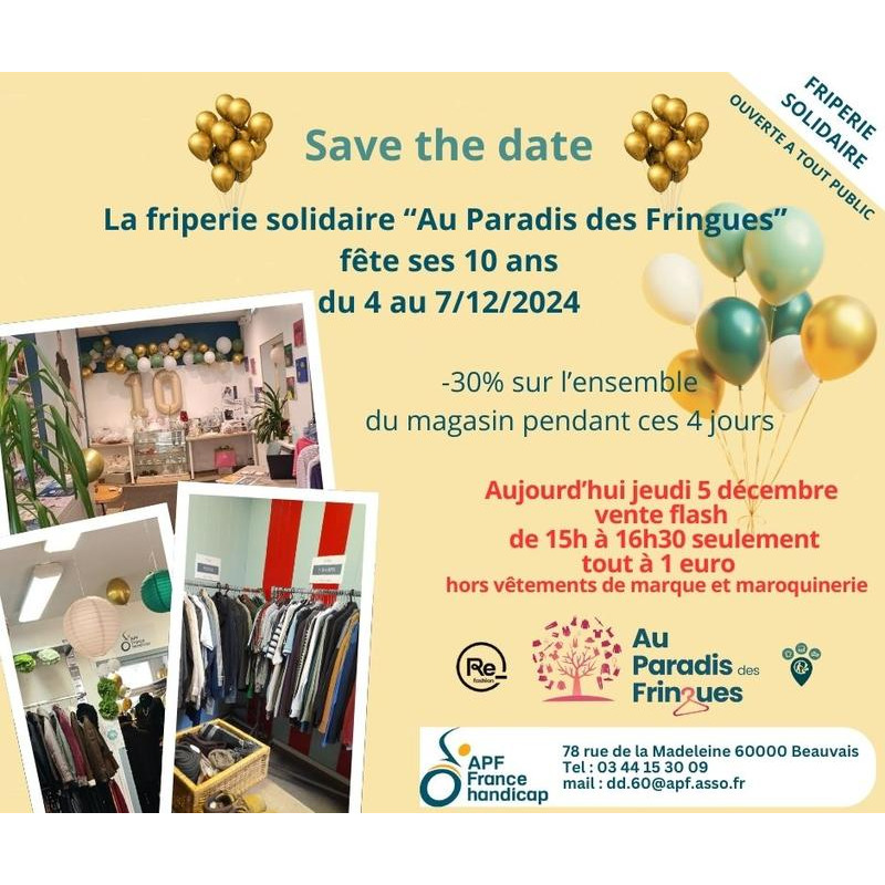 La friperie solidaire "au paradis des fringues" fête ses 10 ans du 4 au 7 décembre 2024 avec - 30 % sur l'ensemble du magasin. Mais attention aujourd'hui de 15h à 16h30 seulement vente flash "tout a 1 euro". Que vous veniez à n'importe quel moment de la journée ou pendant la vente flash, vous ferez toujours une bonne affaire... On vous attend !