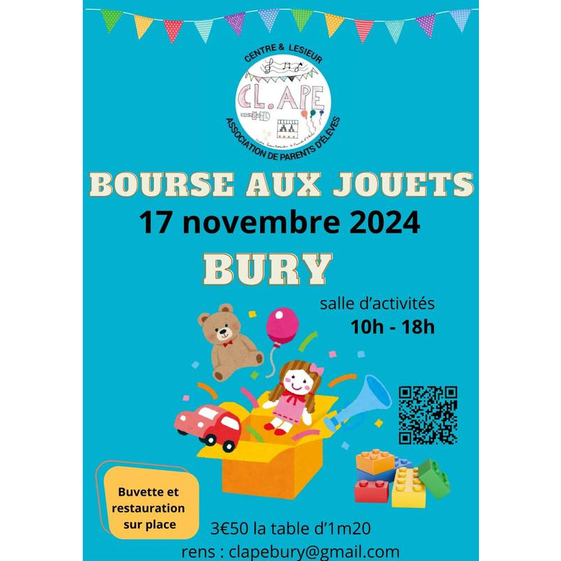 L'association de parents d'élèves cl.Ape organise une bourse aux jouets dans la salle d'activité de bury. Buvette et restauration possible sur place. Entrée gratuite