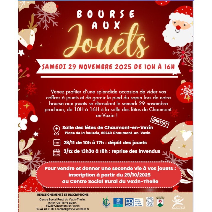 Venez profiter d’une splendide occasion de vider vos coffres à jouets et de garnir le pied du sapin lors de notre bourse aux jouets se déroulant le samedi 29 novembre prochain, de 10h à 16h à la salle des fêtes de chaumont-en-vexin ! Salle des fêtes de chaumont-en-vexin place de la foulerie, 60240 chaumont-en-vexin