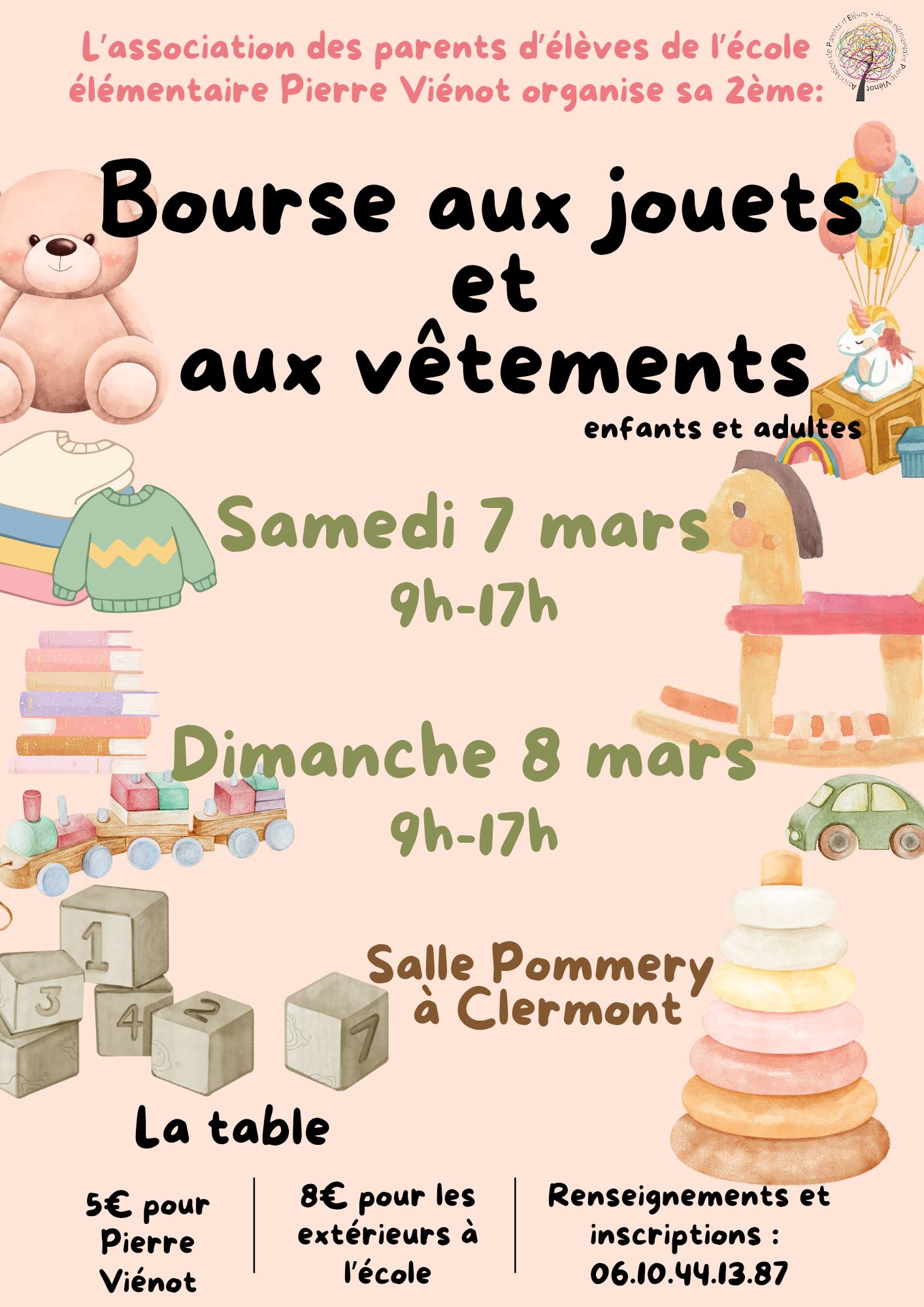 Bonjour , afin d'aider au financement des sorties de fin d'année des élèves de l'école élémentaire Pierre Vienot, l'association des Parents d'élèves organise une bourse aux jouets, puériculture, vêtements enfants et adultes le 7 et 8 mars 2026 à la salle Pommery de 9h à 17h