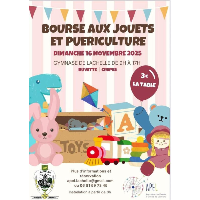 L’association des parents d’élèves de lachelle apel lachelle organise sa grande bourse aux jouets et matériel de puériculture ! Venez faire de bonnes affaires à quelques semaines des fêtes : jeux, jouets, livres, vêtements enfants, matériel bébé… à petits prix ! Sur place : crêpes, boissons et bonne humeur pour petits et grands ! N’hésitez pas à partager l’info autour de vous et à venir nombreux !