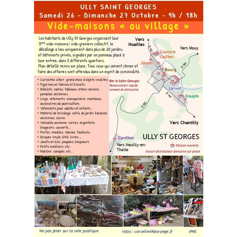 Les habitants de ully st georges organisent leur 5eme vide-maisons/ vide-greniers collectif, le déballage a lieu uniquement dans 23 jardins et bâtiments privés, signalés par un panneau placé à leur entrée, dans 5 différents quartiers ou hameau de la commune.