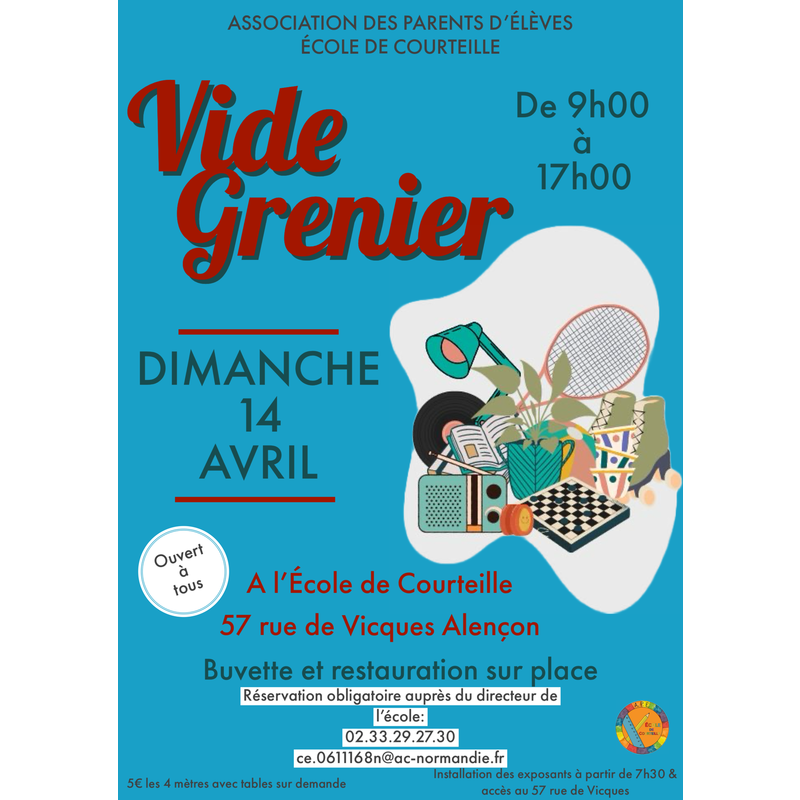 Le dimanche 14 avril de 9h à 17h se tiendra la deuxième édition du vide grenier organisé par l'ape de l'école de courteille. L'accès se fera par le 57 rue de vicques, à l'arrière de l'école .