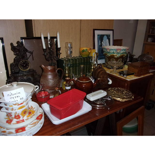 vaisselle, décoration, soupière en faïence de moustiers faïencerie lallier, linge de maison, tissu d'ameublement, fil à crocheter, couverture woolmark, draps en lin lavé linvosges, lampe de luminothérapie lumie brightspark, platine telefunken ambio 3003 s, années 80 en bon état (possibilité d'apporter ses vinyles pour l'essayer), objets divers, vêtements de saison homme et femme, etc, etc...
