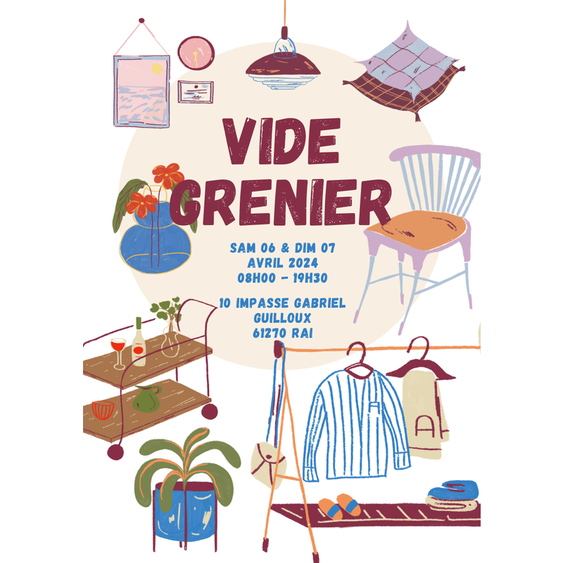 veuillez trouver une annonce pour un vide grenier à domicile (vaisselles en tout genre, livres, vêtements, bibelots, décoration, cadres, meubles à rennover...). Cela se passe les 6 et 7 avril 2024, de 8h00 à 19h30 au 10 impasse gabriel guilloux 61270 rai.