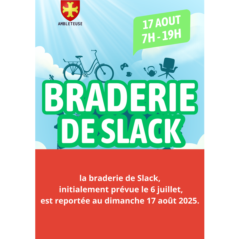 Suite aux mauvaises conditions météo, la braderie de slack, qui devait se tenir le 6 juillet dernier, est reportée au dimanche 17 août 2025.