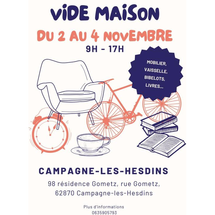 Bibelots, vaisselle, meubles, outillage jardin et maison, livres etc.
