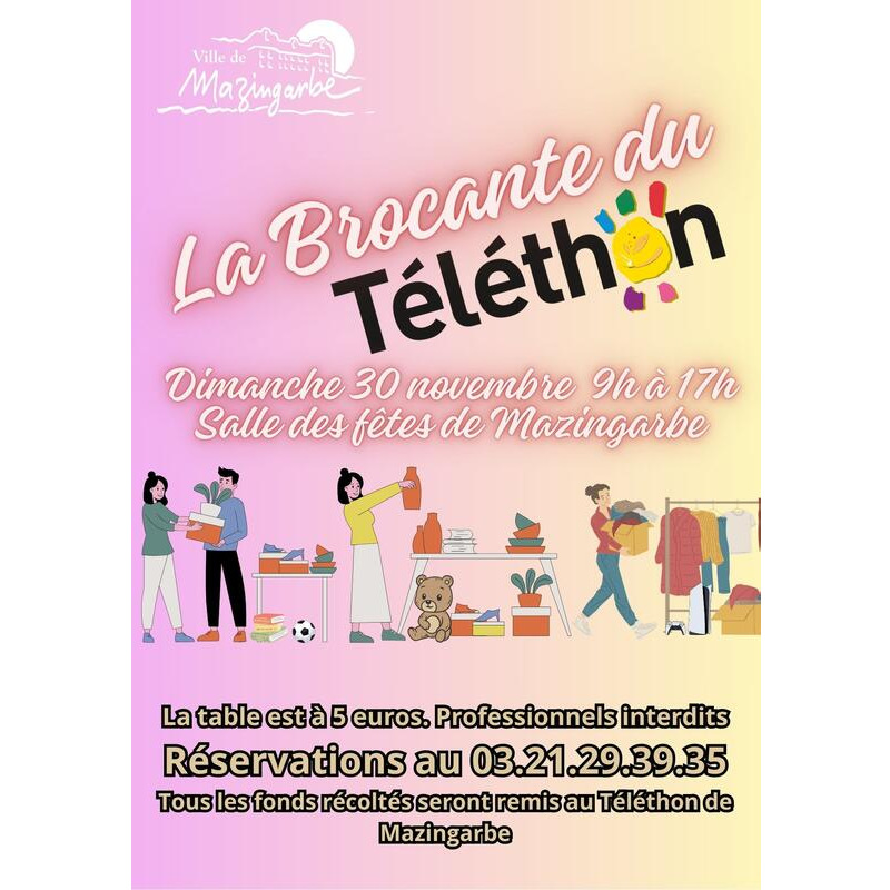 Le restaurant la cuisine à l'authentique et le comité téléthon de mazingarbe organise une brocante, le dimanche 30 novembre, de 9h à 17h à la salle des fêtes de mazingarbe, située rue décatoire.