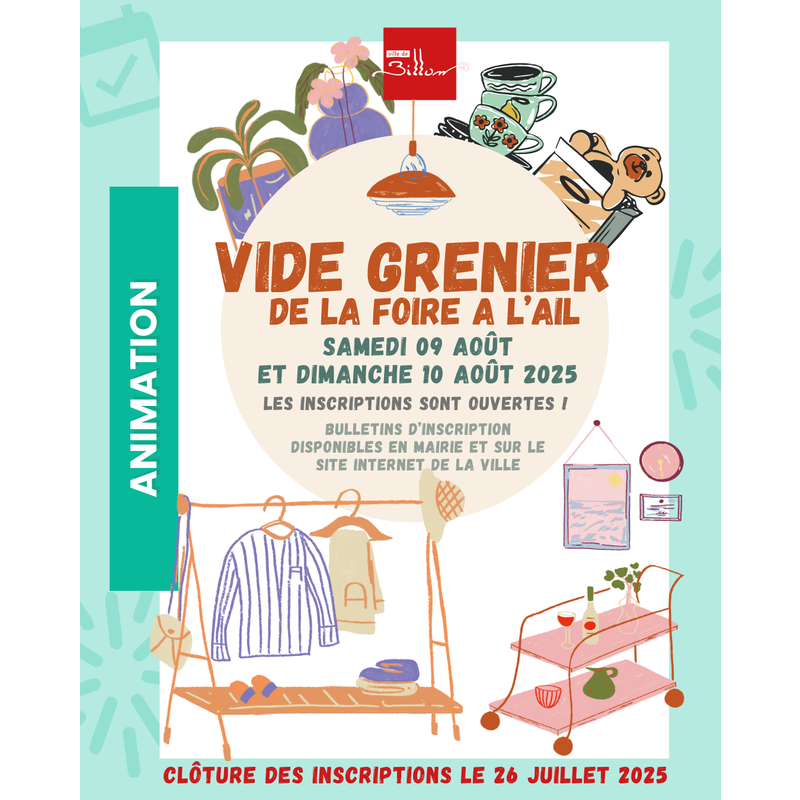 La foire à l'ail est un évènement pour mettre en avant un produit local : l’ail rose. Vente directe, concours de l’ail rose, concours de tresse : une technique non anodine puisqu’elle permet à l’ail de conserver son goût et sa fraîcheur toute une année. Durant cet évènement qui amène des milliers de visiteurs dans le centre-bourg de billom, il y aura un vide-grenier d'organisé.