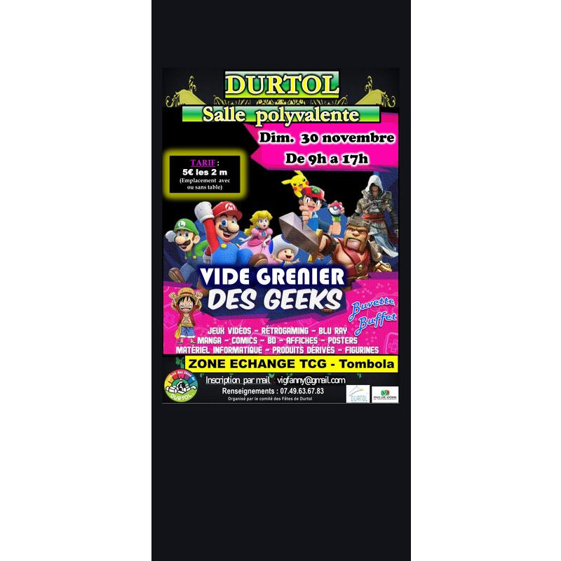 Vide-grenier des geeks – durtol (63) dim. 30 nov. | 9h–17h salle polyvalente de durtol viens chiner, vendre ou échanger tout l’univers geek : jeux vidéo & retrogaming manga, bd, comics figurines, produits dérivés matos info & goodies zone tcg + tombola buvette & buffet sur place ! Exposants : 5€ les 2 m (avec ou sans table) inscriptions : infos ambiance conviviale & passion garantie ! Partage à tes potes geeks #videgreniergeek #durtol #geekevent #retrogaming #manga #jeuxvideo #geeklife #puydedome #auvergne