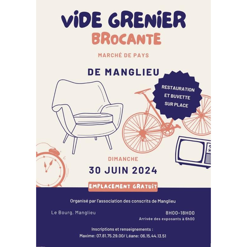 Nous organisons une brocante/ vide grenier qui se déroulera le dimanche 30 juin à partir de 8h. L'entrée est gratuite. Il y aura buvettes ainsi qu'un manage et château gonflable pour enfants sur place. En ce qui concerne la restauration nous organisons un repas sous forme d'inscription. Pour plus de renseignement n'hésitez pas à nous contacter.