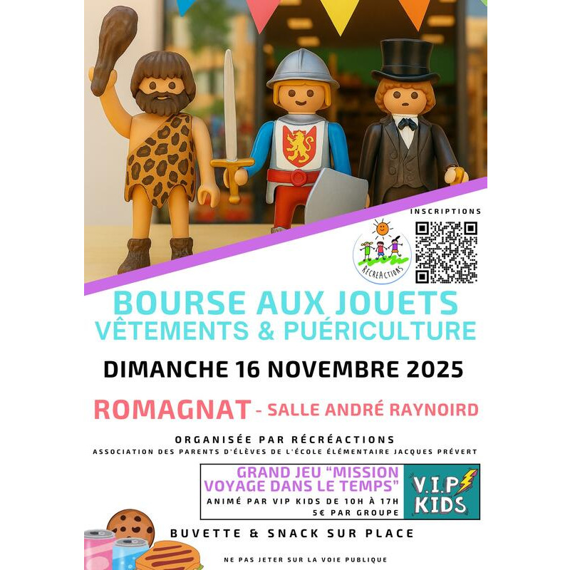 Dimanche 16 novembre, l'association récréactions de parents d'élèves de l'école primaire jacques prévert de romagnat organise de 9h à 18h une bourse aux jouets, vêtements d'enfants et articles de puériculture à la salle andré raynoird de romagnat. Un service de restauration sera disponible sur place. Noël approche, faites un geste pour la planète en achetant des objets d'occasion ! Tous les bénéfices seront reversés à l'école jacques prévert de romagnat.