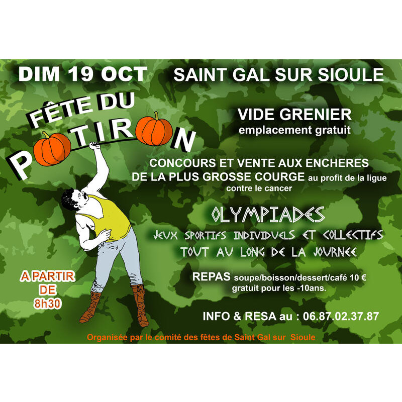 Fête du potiron avec concours de courges et olympiades ouvert à tous petit et grand. Restauration et buvette sur place repas offert pour les moins de 10 ans et repas complet 10 e. Réservation et information