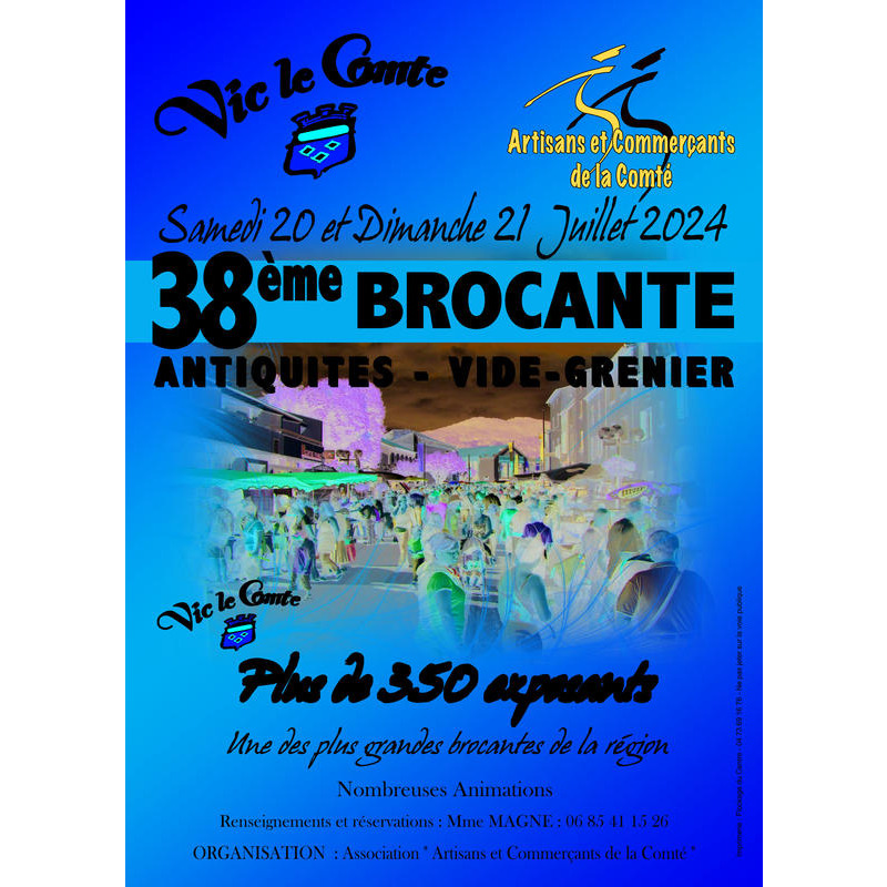 Samedi 20 juillet 2024 de 08h00 à 18h30 (les samedi 20 et dimanche 21 juillet 2024 à vic le comte se déroulera la 38ème brocante – antiquites – vide grenier organisée par les artisans et commerçants de la comté dans les rues de vic le comte.