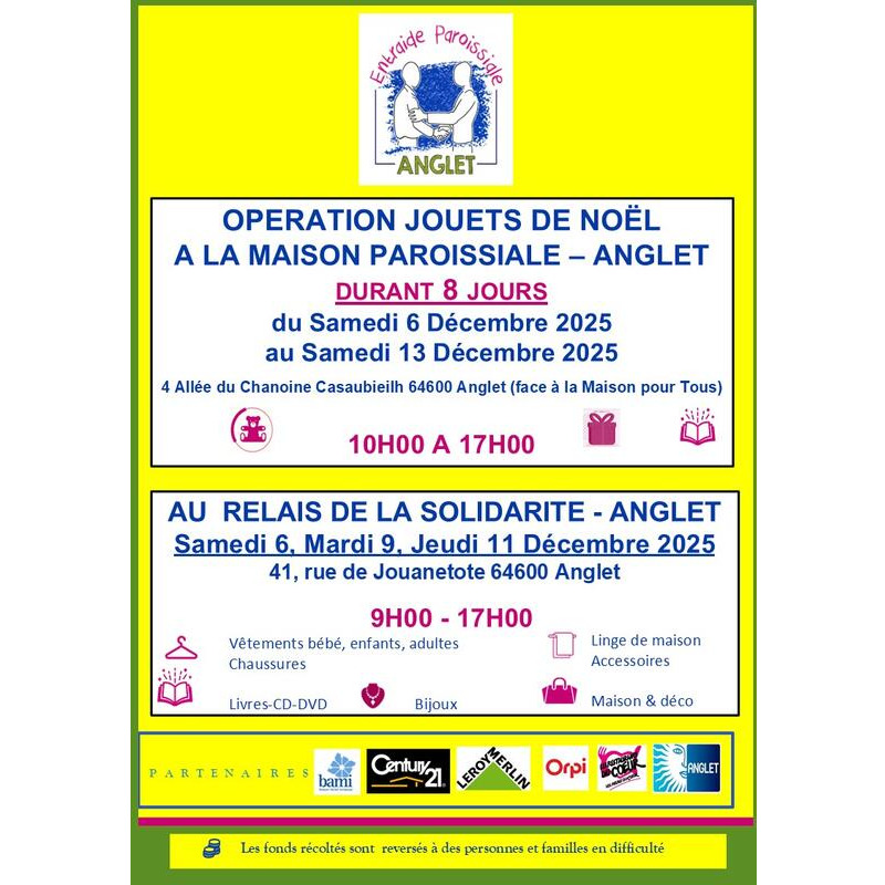 Operation vente de "jouets de noel" du samedi 6 decembre au samedi 13 decembre 2025 de 10h00 à 17h00 y compris le dimanche à la "maison paroissiale" 4 allée du chanoine casaubieilh - 64600 anglet (en face de la maison pour tous)