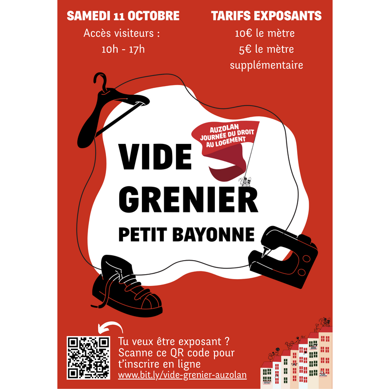 durant cet événement, le samedi 11 octobre, aura lieu un vide-grenier de 10h à 17h, dans la rue marengo et la rue des visitandines à bayonne. Pour plus d'informations sur l'événement : https://www.alda.eus/auzolan-2025-vide-grenier-inscriptions/