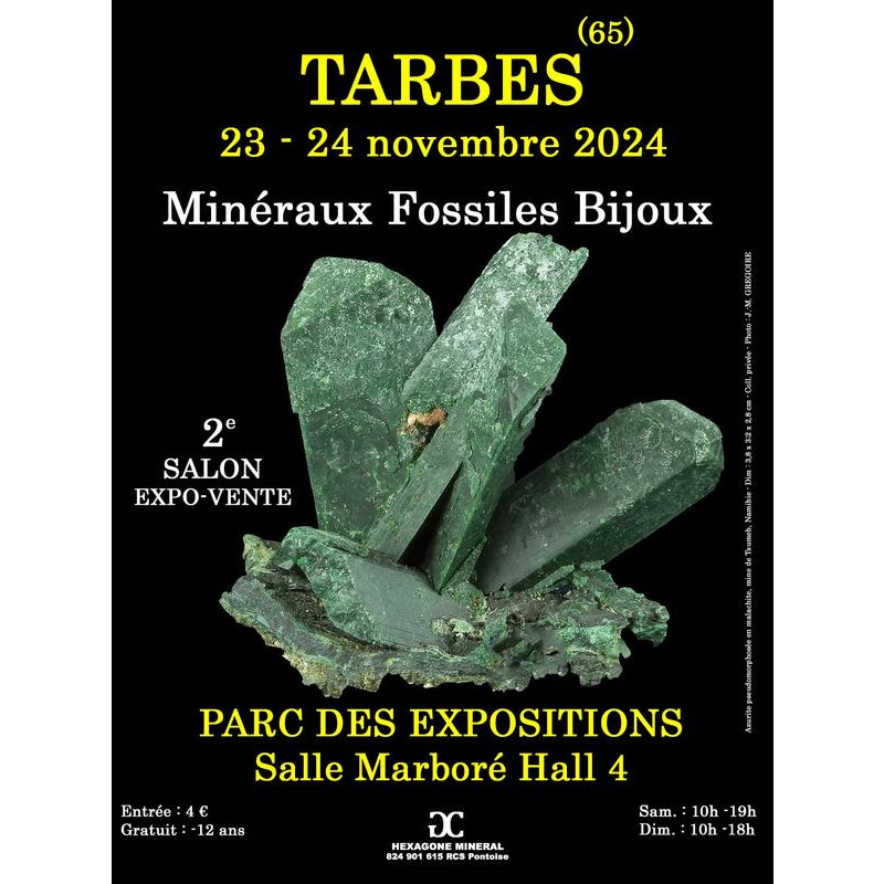 Hexagone mineral vous donne rendez-vous les 23 et 24 novembre 2024 à tarbes (hautes-pyrénées) pour le 2e salon mineraux fossiles bijoux. Cet événement se déroulera dans le hall marbore du parc des expositions situé sur le boulevard du président kennedy. Pour animer cet événement, nous nous associerons à 25 exposants professionnels et amateurs, connus pour la qualité de leur stand. Ces spécialistes montreront aux visiteurs leurs dernières nouveautés en provenance du monde entier, des quatre coins de france et bien sûr des pyrénées. Pour répondre toujours plus aux attentes du public, un service d'expertise gratuite sera aussi proposée par les organisateurs à celles et ceux qui souhaitent faire déterminer leurs découvertes minéralogiques ou paléontologiques. Les collectionneurs comme les curieux pourront découvrir à cette occasion de nombreux minéraux et fossiles provenant de la chaîne des pyrénées avec de belles surprises sorties des collections pour l'occasion. Ce salon ravira les collectionneurs toujours à la recherche de spécimens esthétiques et rares et émerveillera à coup sûr les néophytes et les plus jeunes en les sensibilisant au patrimoine minéralogique de la région.