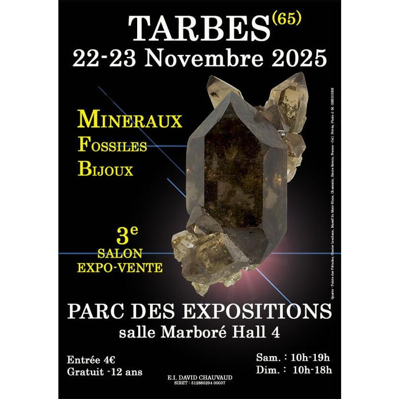 Hexagone mineral vous donne rendez-vous les 22 et 23 novembre 2025 à tarbes (hautes-pyrénées) pour le 3e salon mineraux fossiles bijoux. Cet événement se déroulera dans la salle marbore (hall 4) du parc des expositions situé sur le boulevard du président kennedy. Pour animer cet événement, entre 20 et 25 exposants professionnels et amateurs, connus pour la qualité de leur stand seront présents. Ces spécialistes montreront aux visiteurs leurs dernières nouveautés en provenance du monde entier, des quatre coins de france et bien sûr des pyrénées. Pour répondre toujours plus aux attentes du public, un service d'expertise gratuite sera aussi proposée par l'organisateur à celles et ceux qui souhaitent faire déterminer leurs découvertes minéralogiques ou paléontologiques. Les collectionneurs comme les curieux pourront découvrir à cette occasion de nombreux minéraux et fossiles provenant de la chaîne des pyrénées avec de belles surprises sorties des collections pour l'occasion. Ce salon ravira les collectionneurs toujours à la recherche de spécimens esthétiques et rares et émerveillera à coup sûr les néophytes et les plus jeunes en les sensibilisant au patrimoine minéralogique de la région.