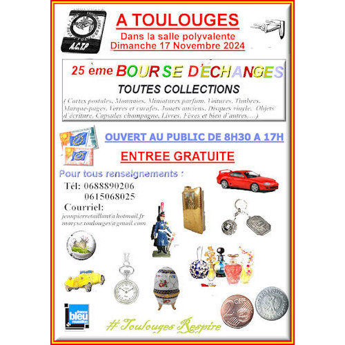 Une bourse d'échange toutes collections est organisée par l'association toutes collections le 17 novembre 2024 à partir de 8h30 à la salle polyvalente de toulouges. L'entrée est gratuite