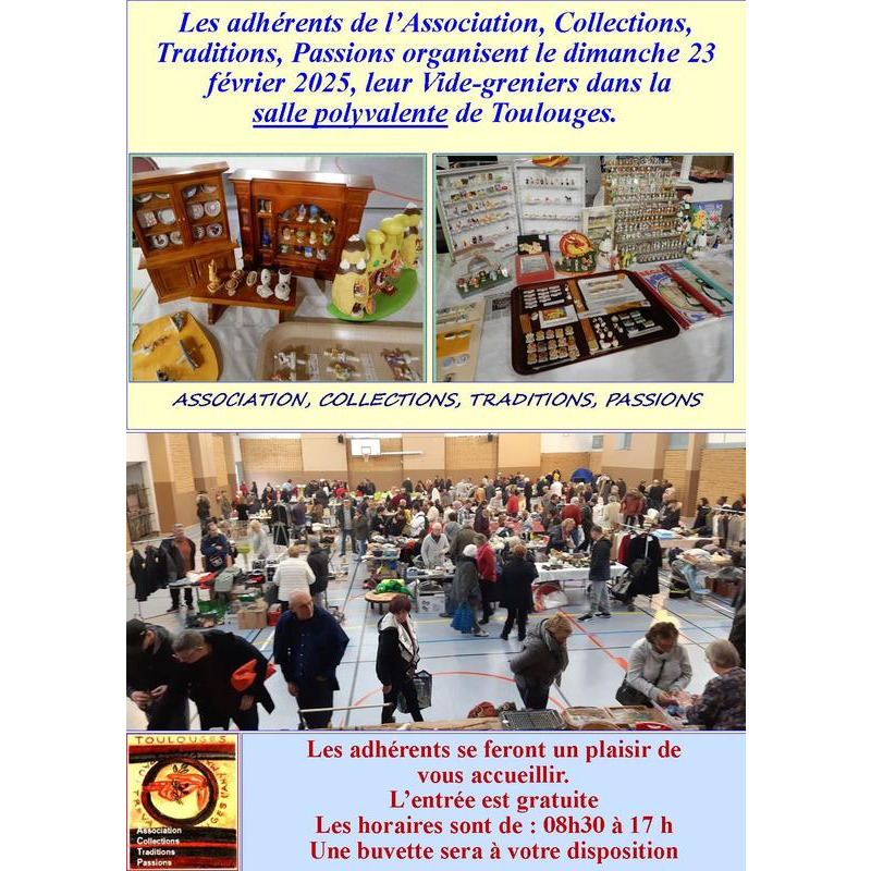 Les adhérents de l'association collections traditions passions, organisent leur vide greniers le 23 février 2025 de 8h30 à 17h, à la salle polyvalente de toulouges. Une buvette sera à la disposition des visiteurs
