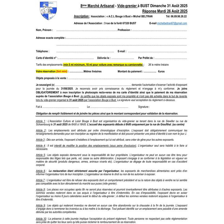 Bust le 31 août de 6h à 18h, 8ième marché artisanal et vide-greniers.