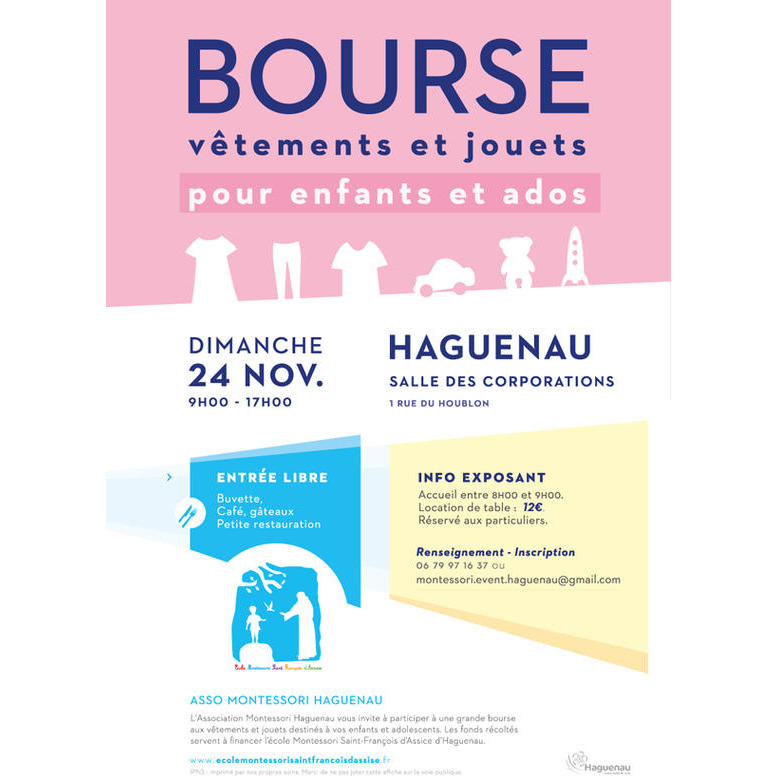 L'association montessori de haguenau vous propose une bourse aux vêtements et jouets pour enfants et ados à la salle des corporations qui est chauffée, le dimanche 24 novembre, premier weekend du marché de noël, il devrait donc y avoir du monde en ville.