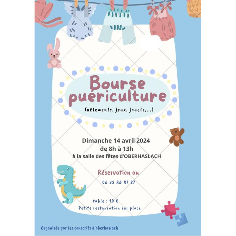 Bourse puériculture le 14 avril 2024 à oberhaslach de 8h00 à 13h00.