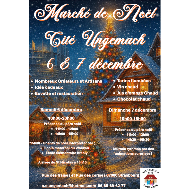 La cité ungemach lance son tout premier marché de noël ! Appel à tous les exposants : artisans, créateurs, passionnés du fait-mains… venez partager vos talents et présenter vos créations locales lors de cette première édition placée sous le signe de la convivialité et de la magie de noël ! Le marché de noël de la cité ungemach rassemble tous les savoir-faire : décoration, bijoux, textile, gourmandises, objets personnalisés… un week-end festif pour faire rayonner la créativité locale ! Dates : • samedi 6 décembre de 10h à 20h • dimanche 7 décembre de 10h à 18h au programme : • restauration sur place tout le week-end • animations pour petits et grands • présence du père noël les deux jours • visite du saint nicolas le dimanche 7 décembre lieu : cité ungemach, strasbourg